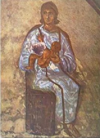 En el arte de las catacumbas, en concreto en la catacumba de Santa Priscila, encontramos la primera representación que aún conservamos claramente de María -segunda mitad del siglo II- al parecer ignorando ya la prohibición veterotestamentaria sobre la representación de imágenes (de lo cual hablaremos ampliamente en este otro artículo). Pero no es una simple imagen de María ni una escena narrativa bíblica, es la representación de un mensaje. Está amamantando a Jesús, con lo cual el centro de atención, más que el niño, es ella. El niño no es un simple “complemento” de María, sino que vuelve la cara y mira de reojo al espectador, haciéndose presente y dotando así a María de la fuerza derivada de ser su Madre, la que le amamantó. Sobre su cabeza una estrella, y a su derecha un hombre, el profeta Balaam, señala con el índice a la estrella. El hombre lleva toga de filósofo, que es la manera normal en el arte de las catacumbas de representar a los profetas bíblicos (por asociación de ideas). Esta escena alude a la profecía bíblica siguiente: