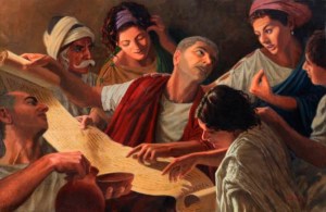 Primeros cristianos discutiendo las escrituras