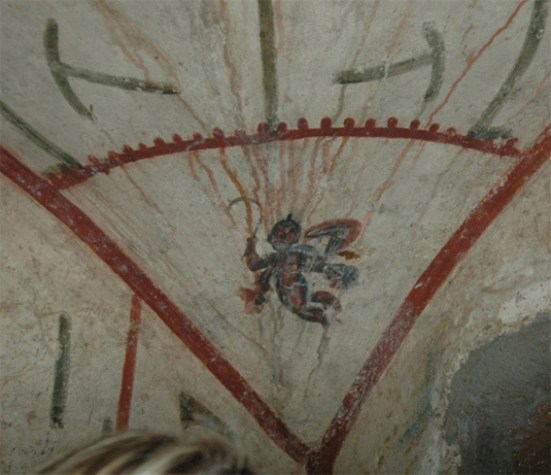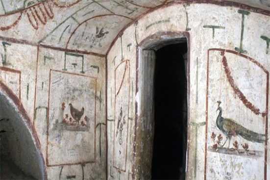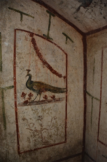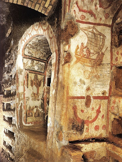 Las catacumbas cristianas aparecen más de un siglo después, en el siglo II, y aquí la profusión de imágenes es aún mayor, sin que se note el más mínimo rechazo o precaución frente a la figura humana en ningún momento. Sin embargo hay muchos motivos y símbolos que veíamos en las catacumbas judías y que encontramos ahora en estas catacumbas cristianas. Por ello parece claro, y lógico, pensar que las catacumbas judías fueron el modelo para las cristianas, aunque como es normal, y más tratándose aún de una minoría, el lenguaje artístico que utilizan es el que conocían, el romano, aunque sus representaciones sean cristianas. De hecho lo más probable es que para pintar sus catacumbas, tanto judíos como cristianos contratasen a los mismos artistas que contrataban los paganos.