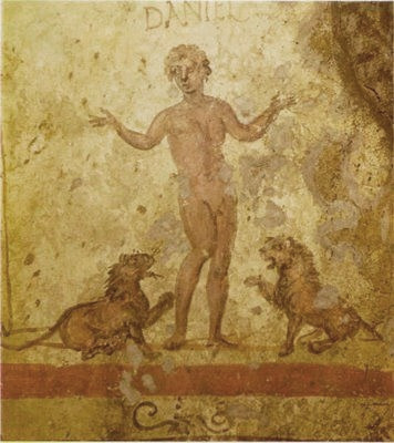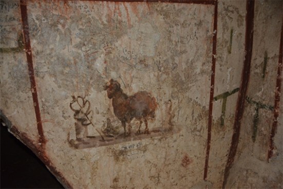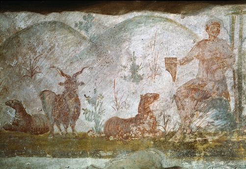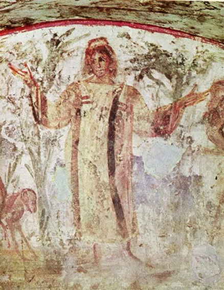 En las catacumbas vemos a veces a Cristo representado como el dios Apolo (el dios sol, la luz), el Ave Fénix se usa como símbolo de la resurrección, los profetas, Jesús y los apóstoles aparecen como filósofos griegos, la escena de Orfeo bajando a los infiernos a rescatar a Eurídice se usa como imagen de la bajada de Jesús a los infiernos, etc. Tal vez para despistar a sus perseguidores, pero probablemente por la sencilla razón de que usaban el lenguaje de su cultura para expresar ideas de su nueva religión. En el siglo segundo vemos por ejemplo un aumento en la producción de lámparas de barro con la típica imagen de Orfeo llevando a hombros un cordero, lo que se explicaría porque los cristianos las compraban como figura de Jesús (el Buen Pastor).